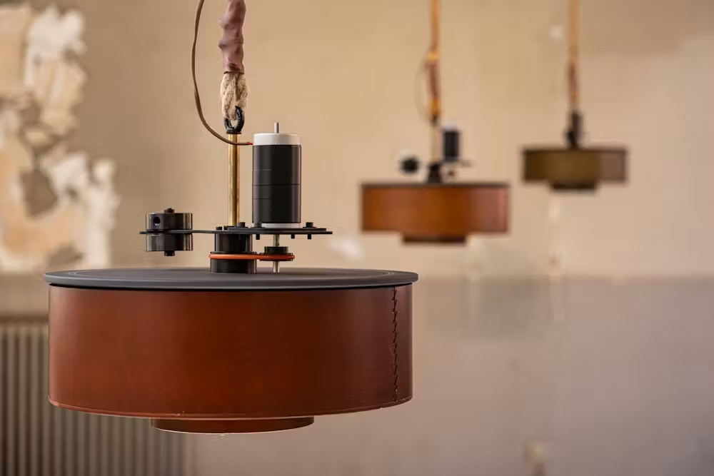 An old spinning top that Mariska de Groot found at a flea market sparked the idea for a sound installation. Immediately fascinated by this colourful children’s toy and its humming harmonies, she delved into the history and mechanics of these ingenious spinning tops. The result is BROM, a choir of motorised, rotating, harmonium-like instruments suspended from the ceiling, creating sounds through a system of air and reeds. Each instrument is tuned differently, creating shifting interferences and rhythmic vibrations, immersing visitors in a hypnotic soundscape as they move through the space.
