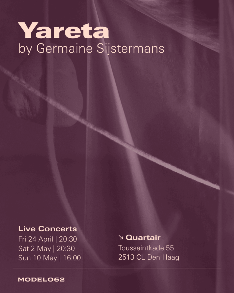 This year’s resident of ensemble Modelo62, Germaine Sijstermans, will develop her new site-specific installation ‘Yareta’, over the period of three weeks at Quartair. Yareta is composed as an open score, making each of the quartet’s three live performances a unique experience. Central to the music is timbre, sound textures, and a continuous interplay with perception itself, for both musicians and listeners.
