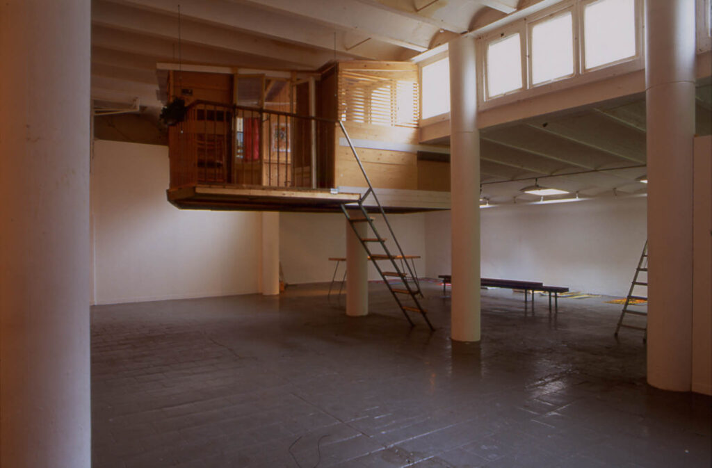 Een hangend gastenverblijf. Deze combinatie tussen een chalet en een vogelnest werd  gebouwd door Quartair voor een drie maanden durend kunsproject, waarbij kunstenaarsinitiatieven en/of broedplaatsen uit binnen- en buitenland uitgenodigd waren om iets van hun werk(wijze) bij het kunstenaarsinitiatief Quartair te laten zien. De uitgenodigde kunstenaars woonden en werkten vanuit  het broedplaats hotel midden in de galerieruimte.
