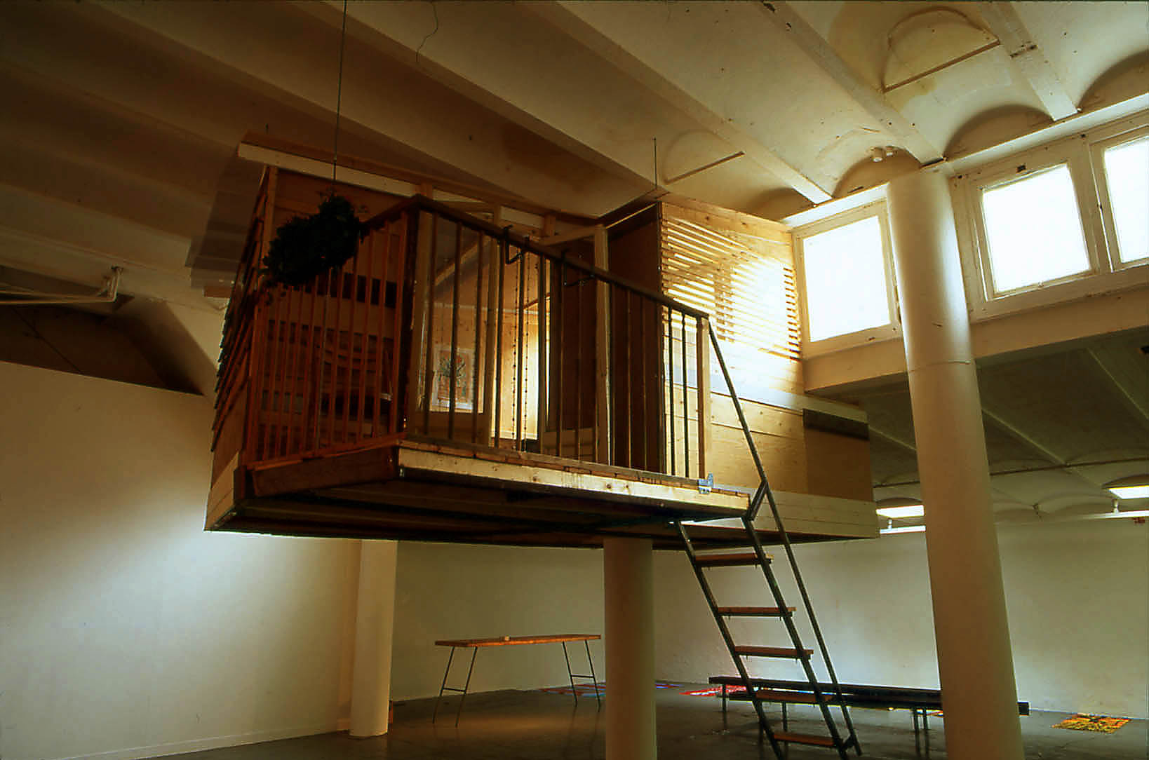 Een hangend gastenverblijf. Deze combinatie tussen een chalet en een vogelnest werd  gebouwd door Quartair voor een drie maanden durend kunsproject, waarbij kunstenaarsinitiatieven en/of broedplaatsen uit binnen- en buitenland uitgenodigd waren om iets van hun werk(wijze) bij het kunstenaarsinitiatief Quartair te laten zien. De uitgenodigde kunstenaars woonden en werkten vanuit  het broedplaats hotel midden in de galerieruimte.